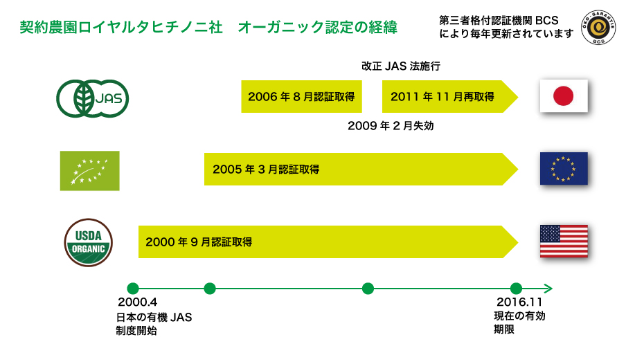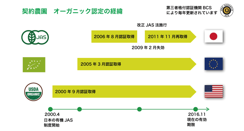 現在は、商品回収は完了し、日本の農林水産省登録外国認定機関であるKIWA BCS/キワ・ビーシーエス・エコ・ギャランティー・ジーエムビーエイチ(ドイツ)により毎年日本、アメリカ、ヨーロッパ各国のオーガニック認証を得ています。